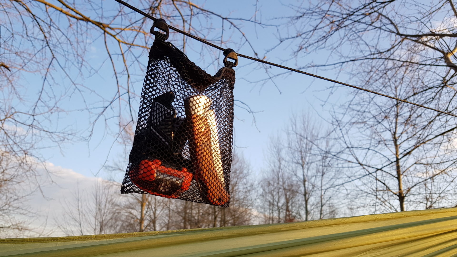 De hangmat wordt geleverd inclusief Whoopie Slings PRO, mesh pocket, stuffsack en ridgeline. De mesh pocket dient als handige gear storage pocket wanneer de hangmat is uitgespannen. Wanneer je hem nat in moet pakken dan kun je hem in deze mesh pocket proppen, doordat deze 2x zo groot is als de stuffsack zal hij gemakkelijk drogen. De bijgeleverde ridgeline kun je boven je opspannen als koord om uitrusting of een lampje aan te bevestigen.